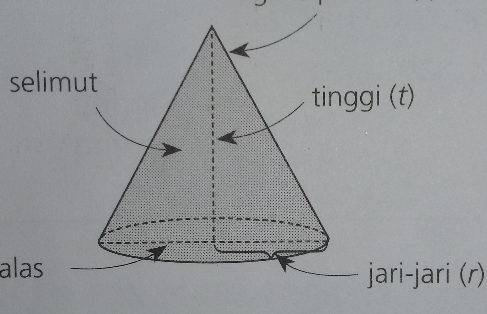 Bentuk alas kerucut sama dengan bentuk alas tabung., bedanya tabung memiliki alas dan tutup berbentuk lingkaran sedangkan pada kerucut hanya alasnya saja yang berbentuk lingkaran. Alas kerucut berbentuk lingkaran dan memiliki sisi selimut kerucut. Tinggi kerucut adalah panjang jarak terdekat dari titik puncak kerucut ke bidang alas.![]() |