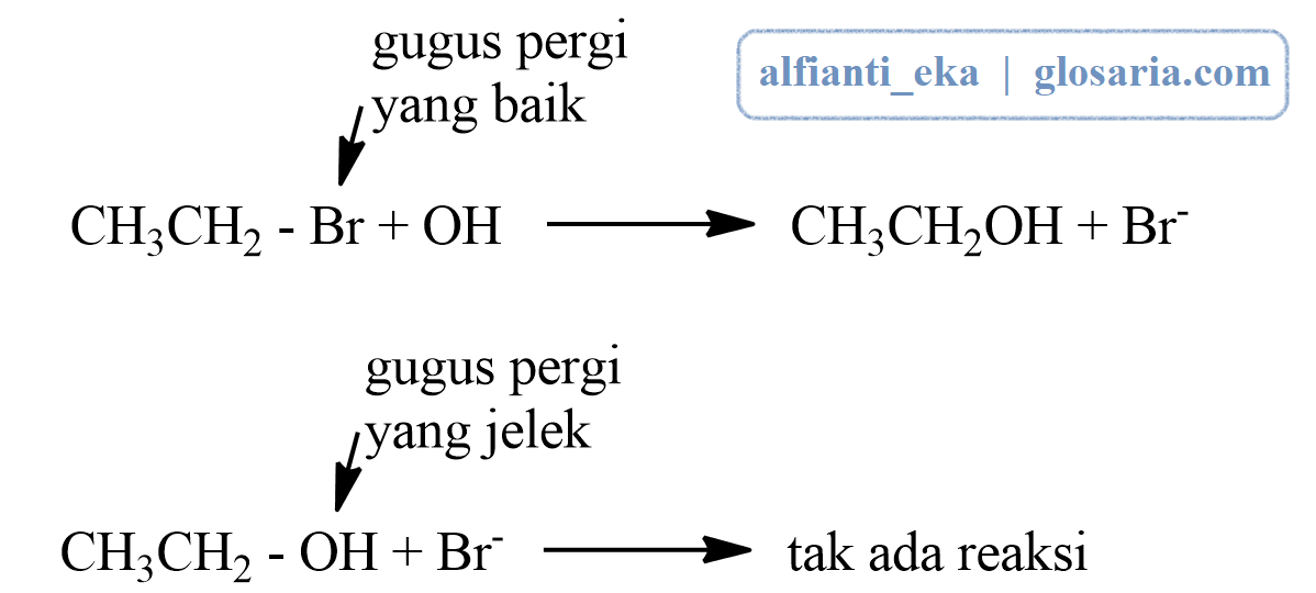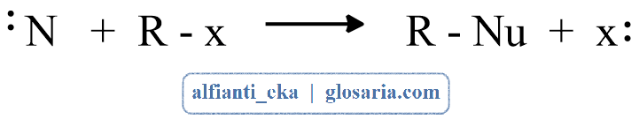 Dengan Nu menandakan nukleofil serta R-x menandakan substrat dengan gugus pergi x. pada reaksi tersebut, pasangan elektron dari nukleofil menyerang substrat membentuk ikatan baru, sementara gugus pergi melepaskan diri bersama dengan sepasang elektron.