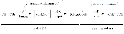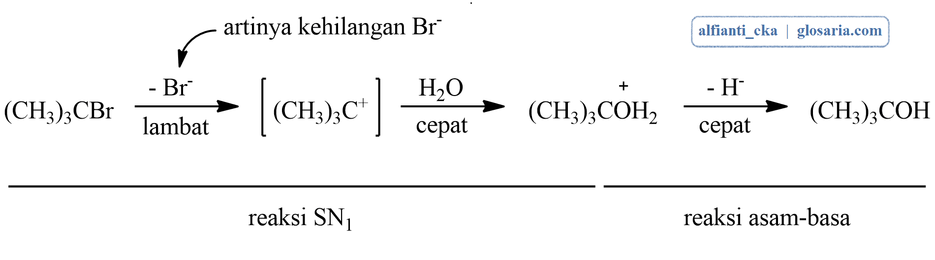 Reaksi SN1 yang terjadi pada suatu alkil halida tersier merupakan reaksi bertahap. Tahap pertama berupa pemutusan alkil halida menjadi sepasang ion, yaitu ion halida dan suatu karbokation. Karena reaksi SN1 melibatkan ionisasi, reaksi-reaksi ini dibantu oleh pelarut seperti H2O, yang dapat menstabilkan ion dengan cara solvasi (solvation).Tahap 2 merupakan terjadinya penggabungan karbokation dengan nukleofil (H2O). Tahap ini menghasilkan produk awal yaitu suatu alkohol berproton.