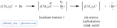 Tahap pertama: pembentukan sebuah karbokation dengan pemisahan gugus pergi.