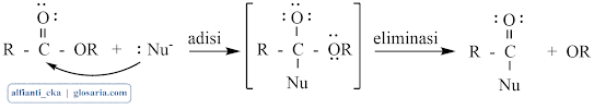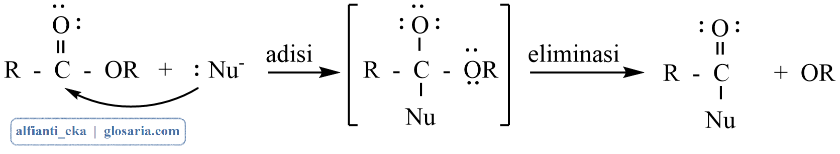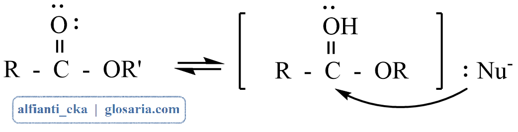 Dalam larutan basa, karbon karbonil suatu ester dapat diserang oleh suatu nukleofil yang baik tanpa protonasi sebelumnya. Jalan adisi-eliminasi ini sama dengan klorida asam dan anhidrida:
