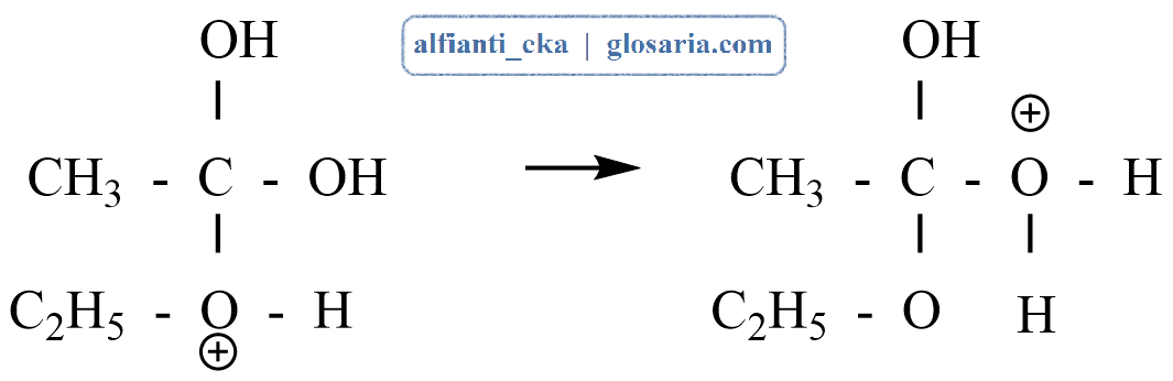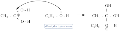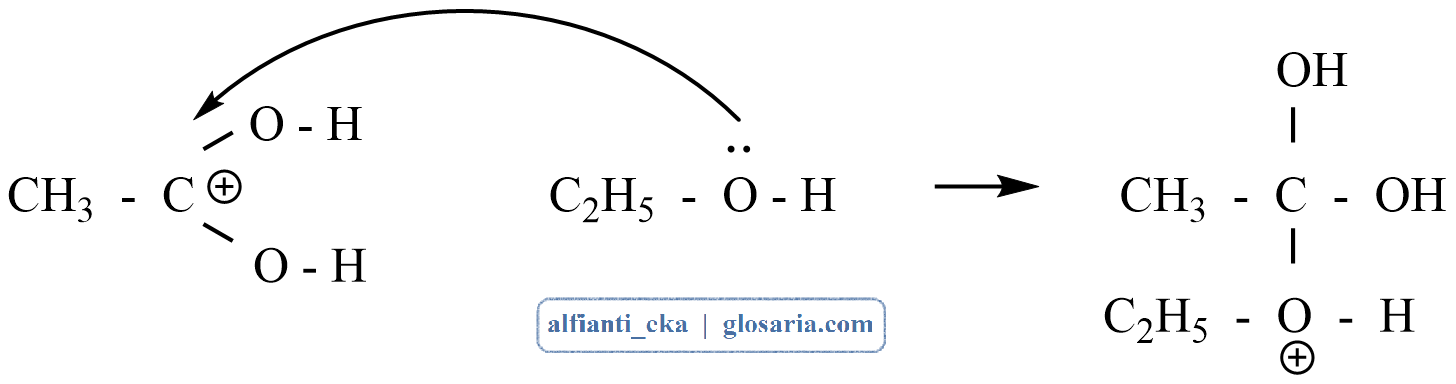 Kemudian karbon yang bermuatan positif diserang oleh PEB dari etanol:
