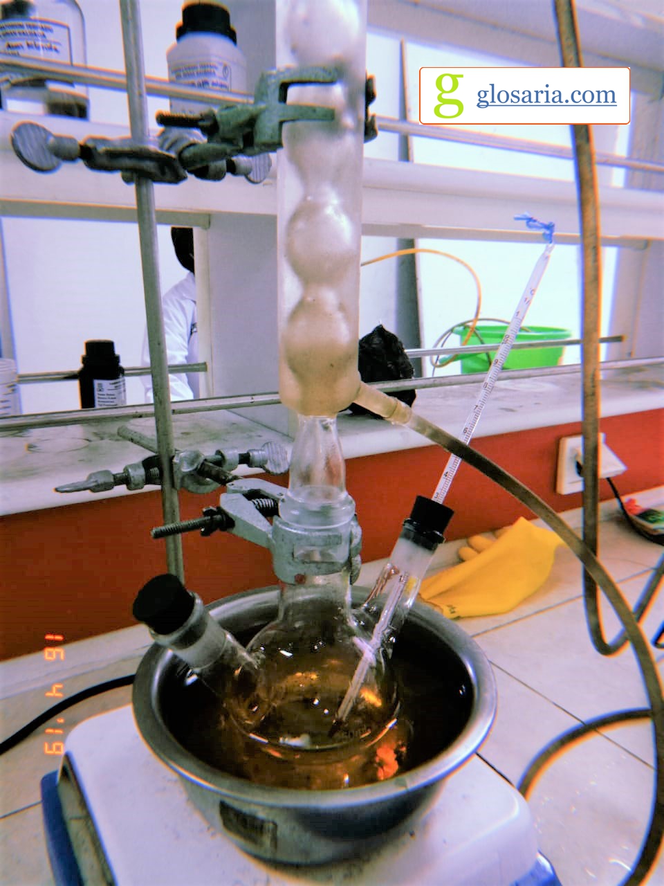 Langkah pertama percobaan ini yaitu dicampurkan larutan etanol, asam asetat glasial, dan asam sulfat pekat kemudian direfluks selama 30 menit dengan suhu maksimal 70oC. Asam sulfat pekat berfungsi sebagai katalis yang digunakan untuk mempercepat reaksi. Campuran larutan direfluks sambil diaduk dengan tujuan agar larutan menjadi homogen dan untuk memutus gugus -OH untuk menyerang karbon karbonil. Refluks digunakan karena senyawa-senyawa yang dicampurkan bersifat mudah menguap. Uap hasil pemanasan akan terkondensasi kembali pada kondensor dan kembali lagi pada larutan awal sehingga didapatkan hasil yang maksimal. Reaksi yang terjadi sebagai berikut: