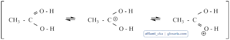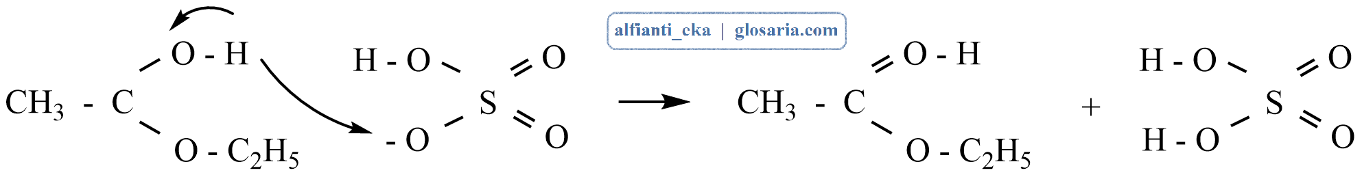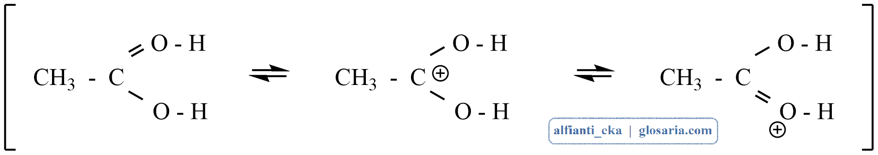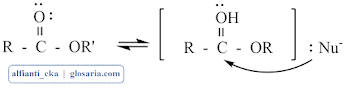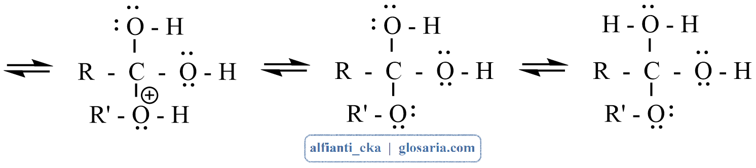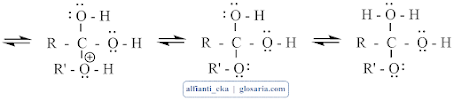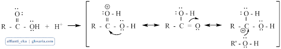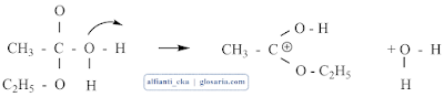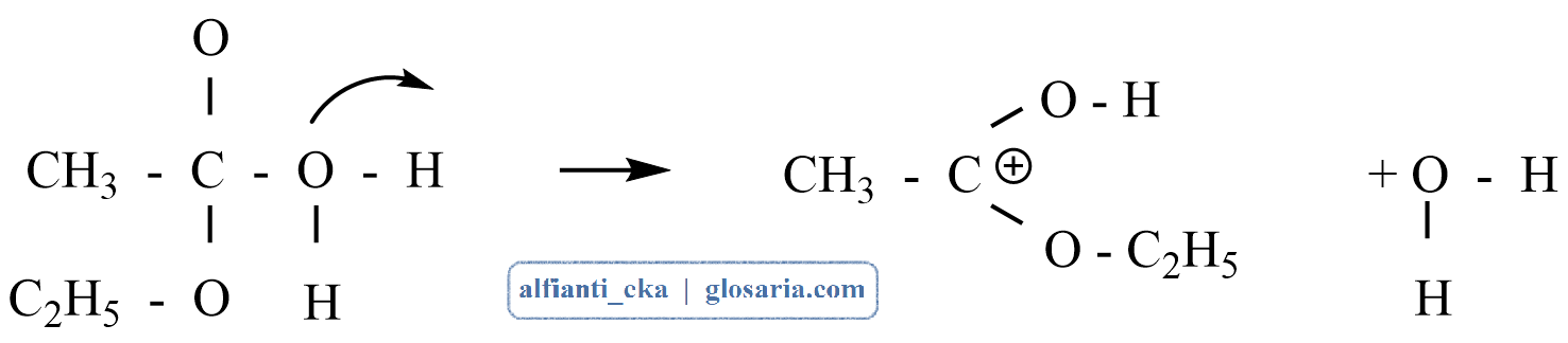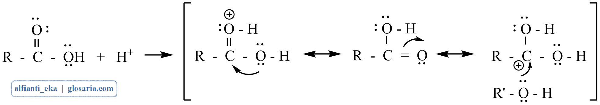 Dalam larutan asam, oksigen karbonil dari suatu ester dapat diprotonasikan kemudian karbonil yang bermuatan positif parsial dapat diserang oleh nukleofil lemah seperti air.