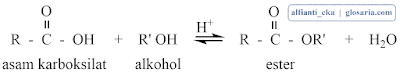 Asam karboksilat apabila direaksikan dengan alkohol dan bantuan katalisator asam akan menghasilkan ester. Reaksi tersebut biasa disebut dengan esterifikasi fischer. Reaksi keseluruhan merupakan pergantian gugus fungsi -OH dari asam karboksilat dengan gugus -OR dari alkohol.