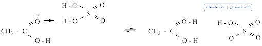 Terjadi transfer proton dari asam sulfat yang kemudian berikatan dengan O2 dan menjadi bermuatan positif, kemudian terjadi delokasi elektron yang membentuk struktur resonansi:
