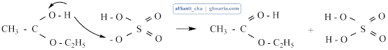 Kemudian hidrogen akan lepas dari oksigen dan bereaksi dengan ion hidrogen sulfat dan berbentuk etil asetat serta katalis asam sulfat.