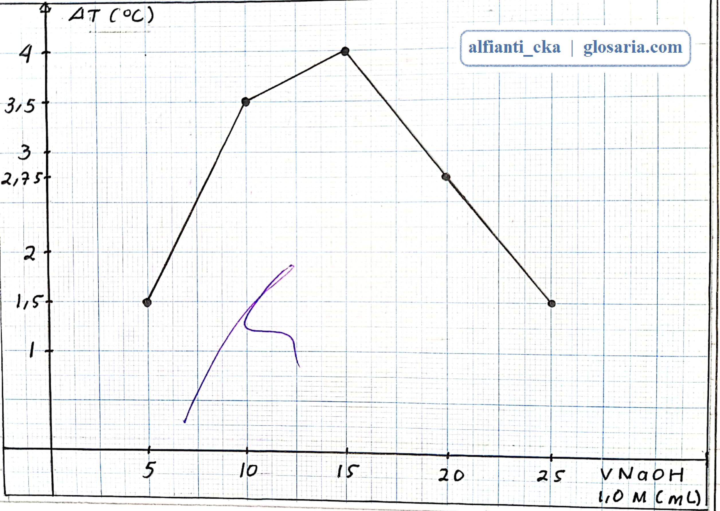 | Grafik hubungan perubahan suhu terhadap volume NaOH 1,0M |