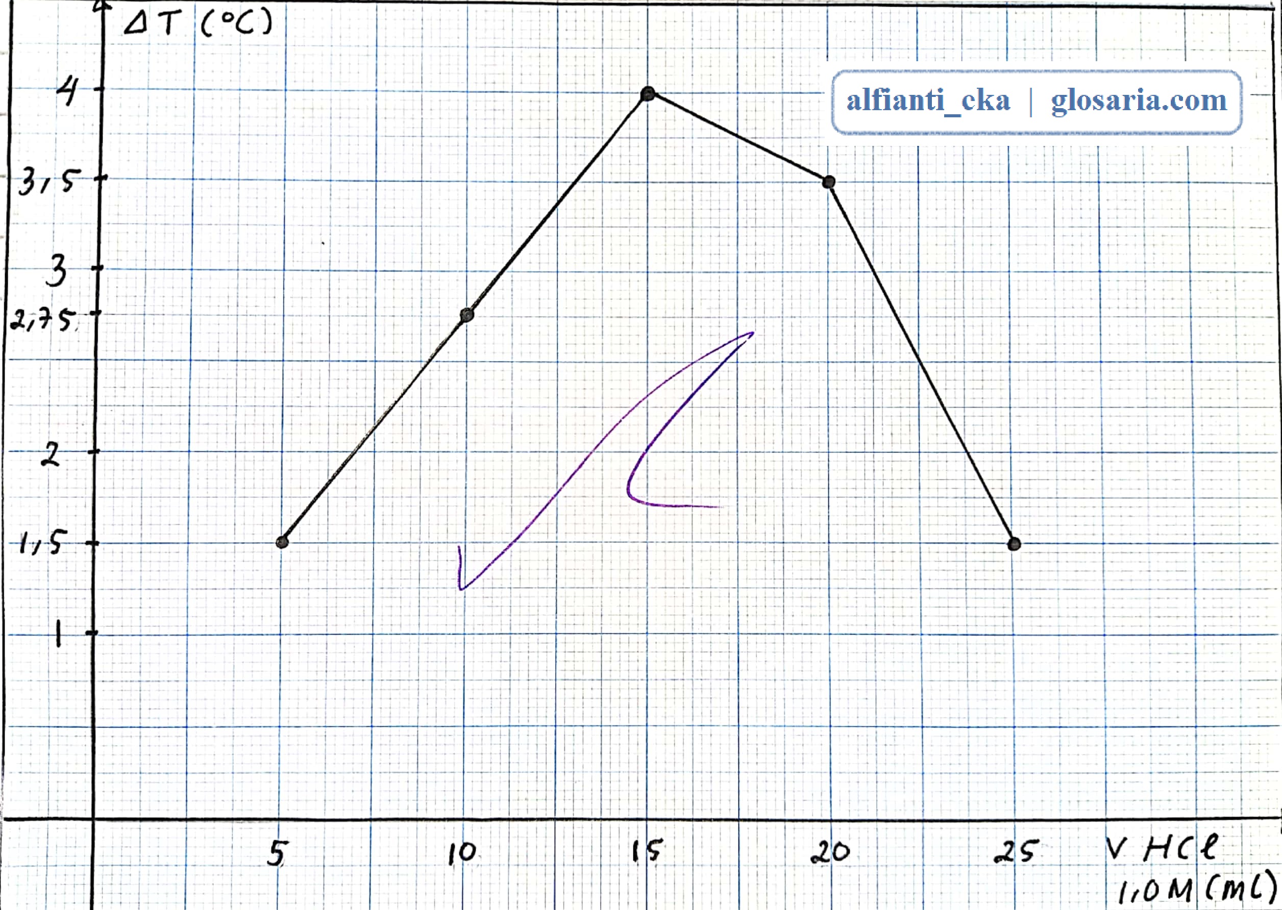 | Grafik hubungan perubahan suhu terhadap volume HCl 1,0M |