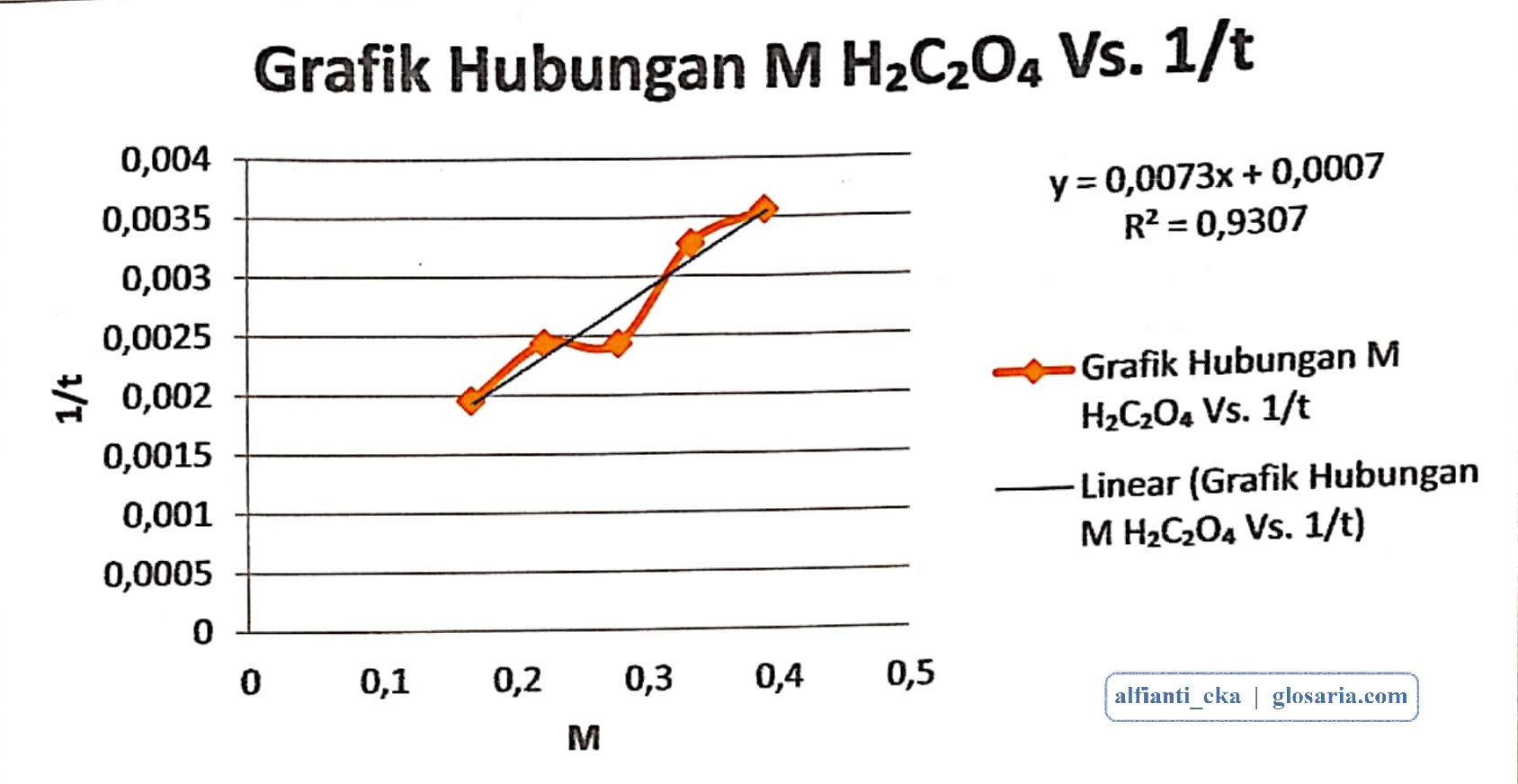 Berdasarkan grafik yang dibuat dari hubungan antara konsentrasi asam oksalat dan 1/t didapat nilai R2 sebesar 0,9307. Grafik hubungan antara [H2C2O4]2 dan 1/t didapat nilai R2 sebesar 0,9373. Sehingga orde reaksi terhadap asam oksalat adalah orde reaksi tingkat 2 dari pendekatan nilai R2.