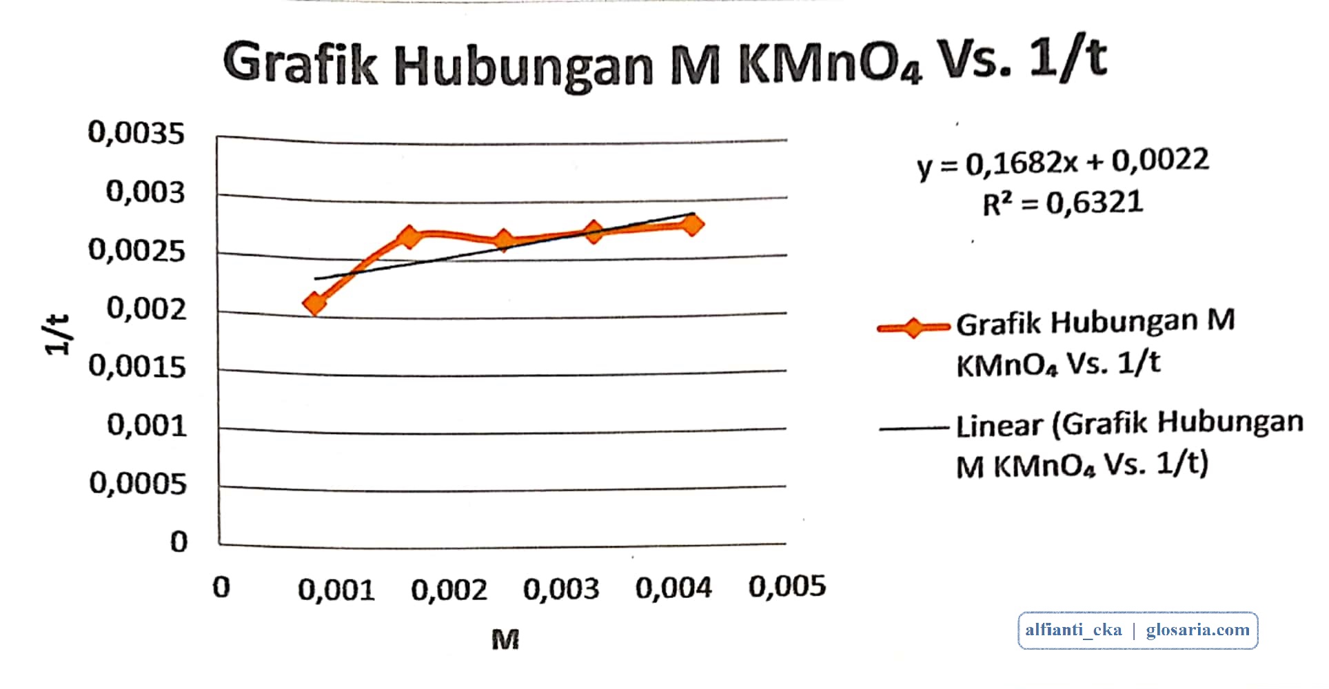 Berdasarkan grafik yang dibuat dari hubungan antara konsentrasi KMnO4 dan 1/t didapat nilai R2 sebesar 0,6321. Grafik hubungan antara [KMnO4]2 dan 1/t didapat nilai R2 sebesar 0,4729. Sehingga orde reaksi terhadap KMnO4 adalah orde reaksi tingkat 1 dari pendekatan nilai R2.