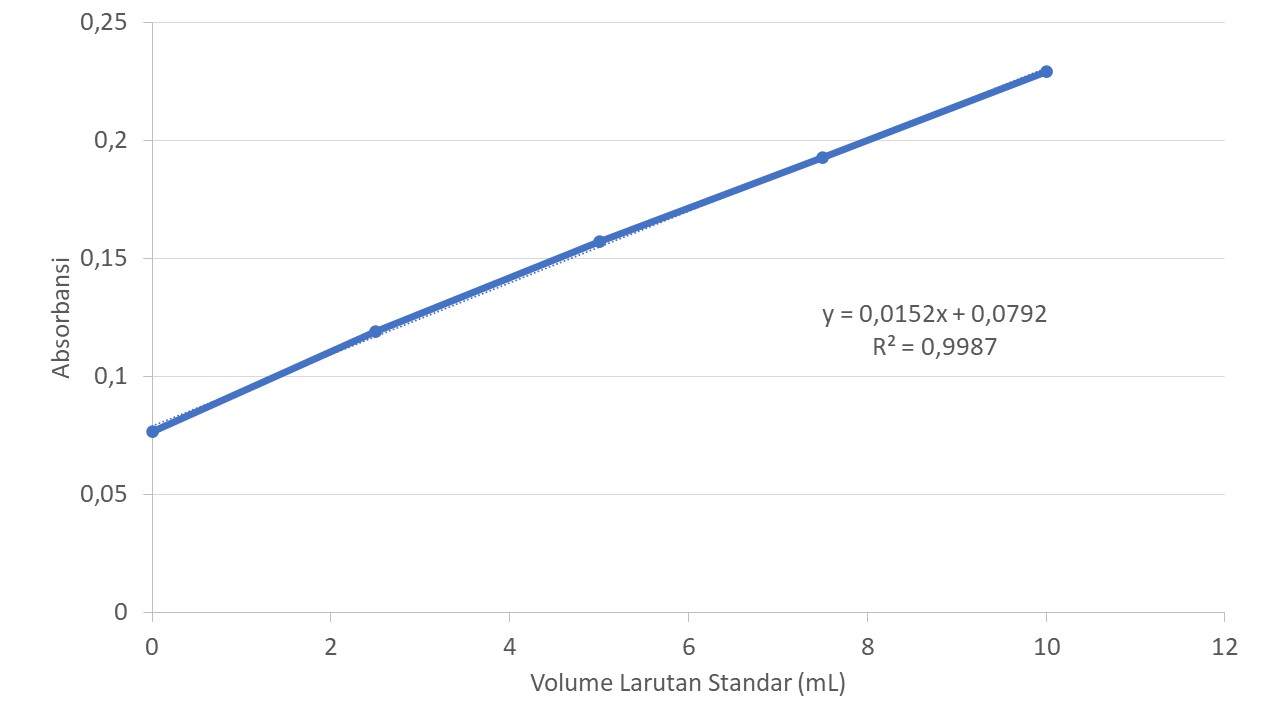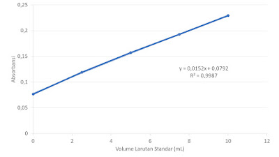 Berdasarkan data absorbansi sampel diketahui bahwa semakin besar konsentrasi suatu larutan, maka semakin besar pula nilai absorbansinya atau penyerapan cahaya oleh atom. Hal ini sesuai dengan teori bahwa absorbansi cahaya berbanding lurus dengan konsentrasi atom. Berdasarkan grafik hubungan antara volume larutan standar dengan absorbansi diperoleh data bahwa grafik tersebut memiliki persamaan y=0,0152x + 0,0792. Dalam hal ini y menunjukkan nilai absorbansi dan x adalah volume larutan standar. Nilai 0,0152 menyatakan kemiringan kurva (m), sedangkan nilai 0,0792 menunjukkan intersep yaitu titik potong antara kurva dengan sumbu y. dari grafik yang dihasilkan diperoleh nilai R2=0,9987. Nilai tersebut menyatakan bahwa terdapat korelasi yang linier antara volume larutan standar dan absorbansi, dan hampir semua titik terletak pada garis lurus dengan gradien yang positif. Nilai R2 yang baik terletak pada kisaran 0,9-1.