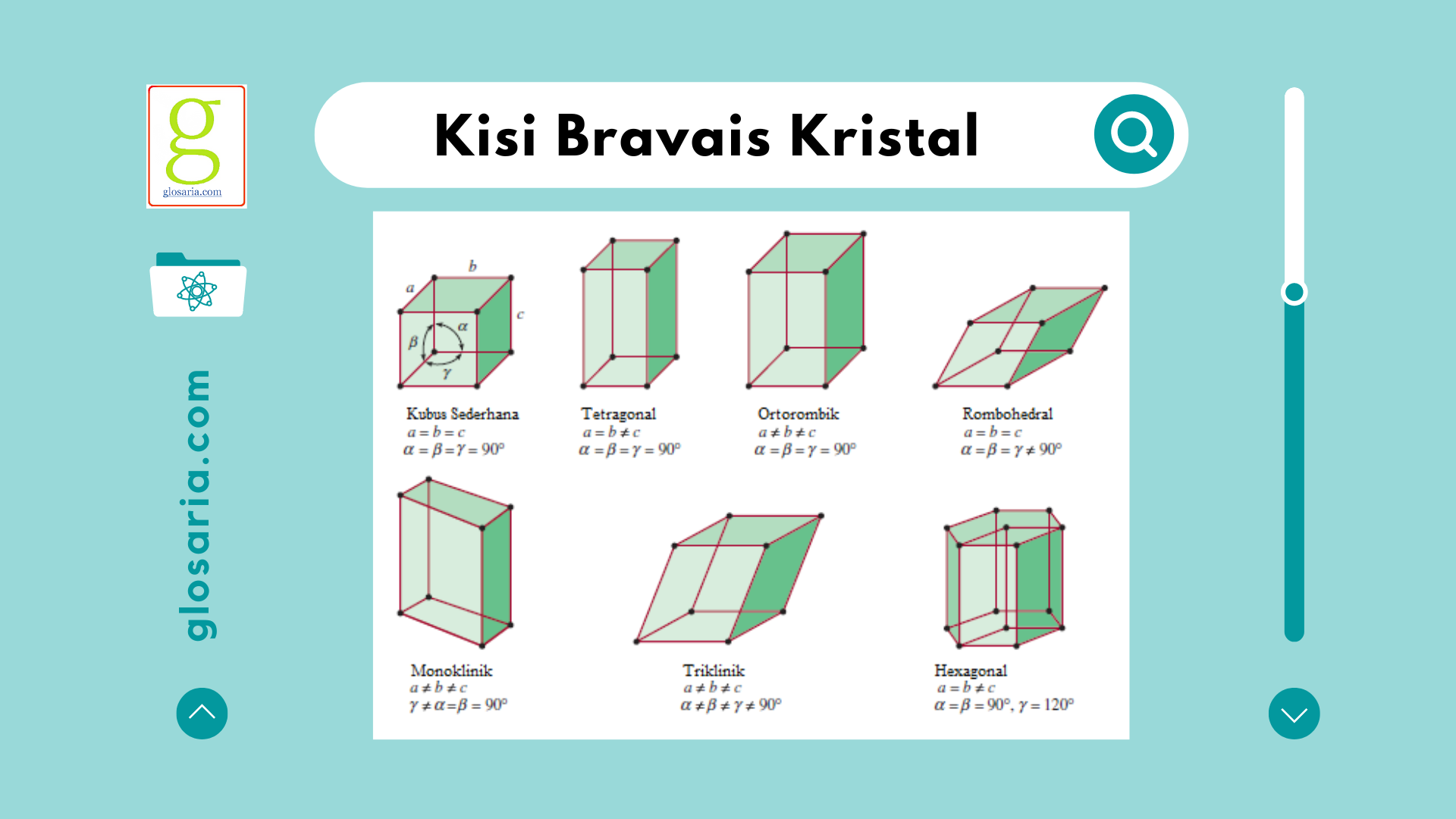 - Kisi bravais yang berjumlah 14 yang dibedakan berdasarkan dari jarak antar titik kisi dan sudutnya. Menentukan volume sama dengan hasil kali sisi a, b, dan c sedangkan luas bidang hasil kali sisi pada permukaan.