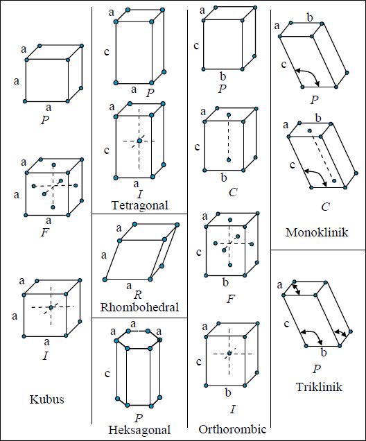 Struktur kristal dapat dibedakan berdasarkan tipe kisi bravais atau kisi ruang yang dibangun pada sifat simetri unit sel dan translasi yang diperlukan dalam memperoleh titik-titik ekuivalen di dalam unit sel yang bersangkutan. Hasilnya adalah empat belas macam bangun geometri kisi bravais sebagaimana ditunjukkan pada gambar 1 (Sugiyarto, 2010).