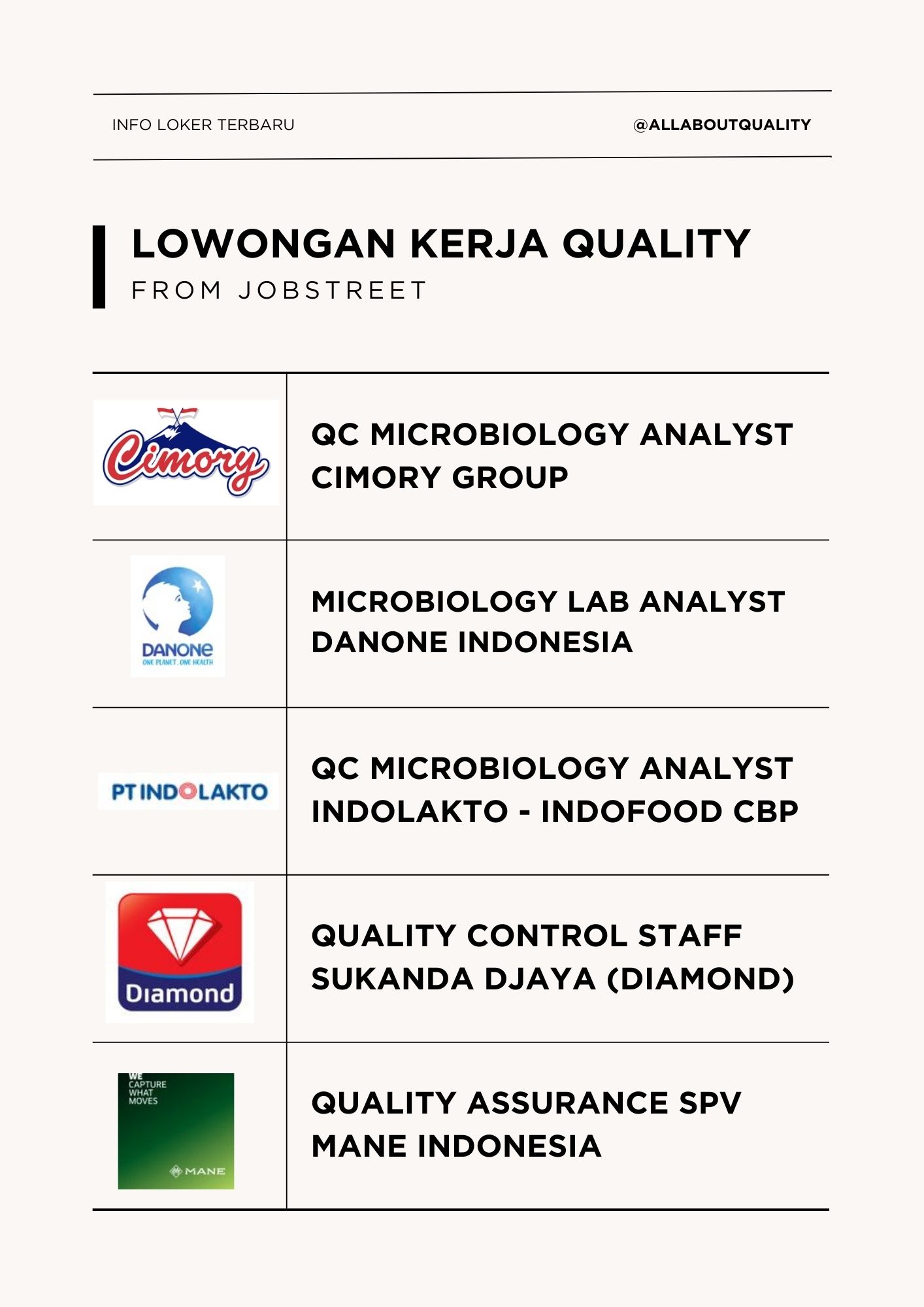 Berikut ini kami rangkumkan kumpulan lowongan kerja quality control dan quality assurance dari perusahan-perusahan besar yang informasi lokernya bisa di lamar via Jobstreet.